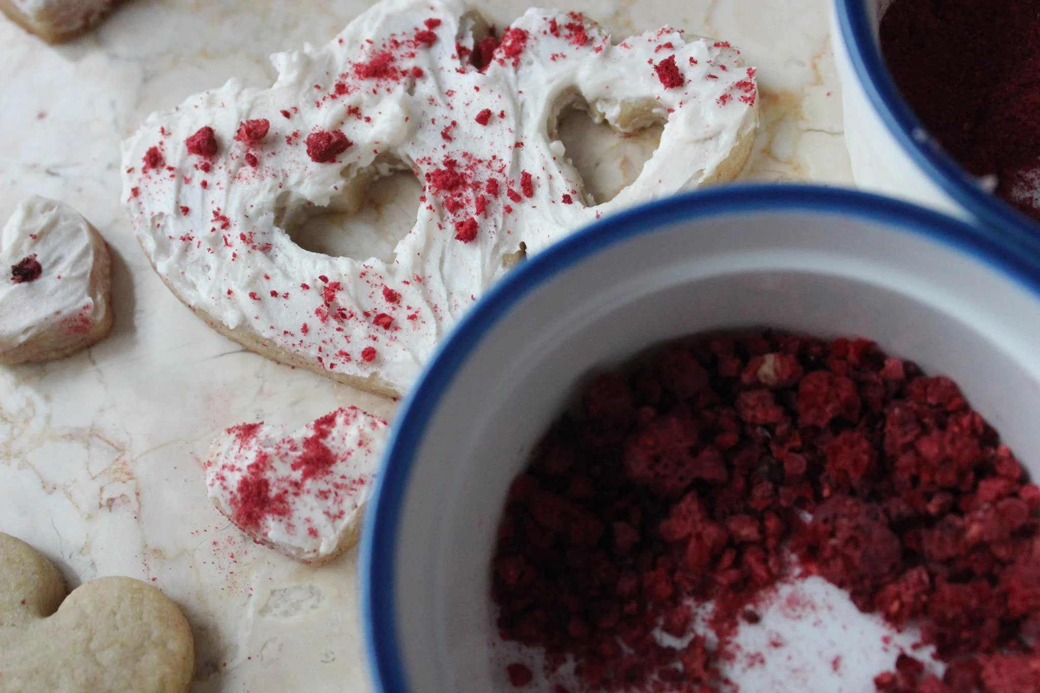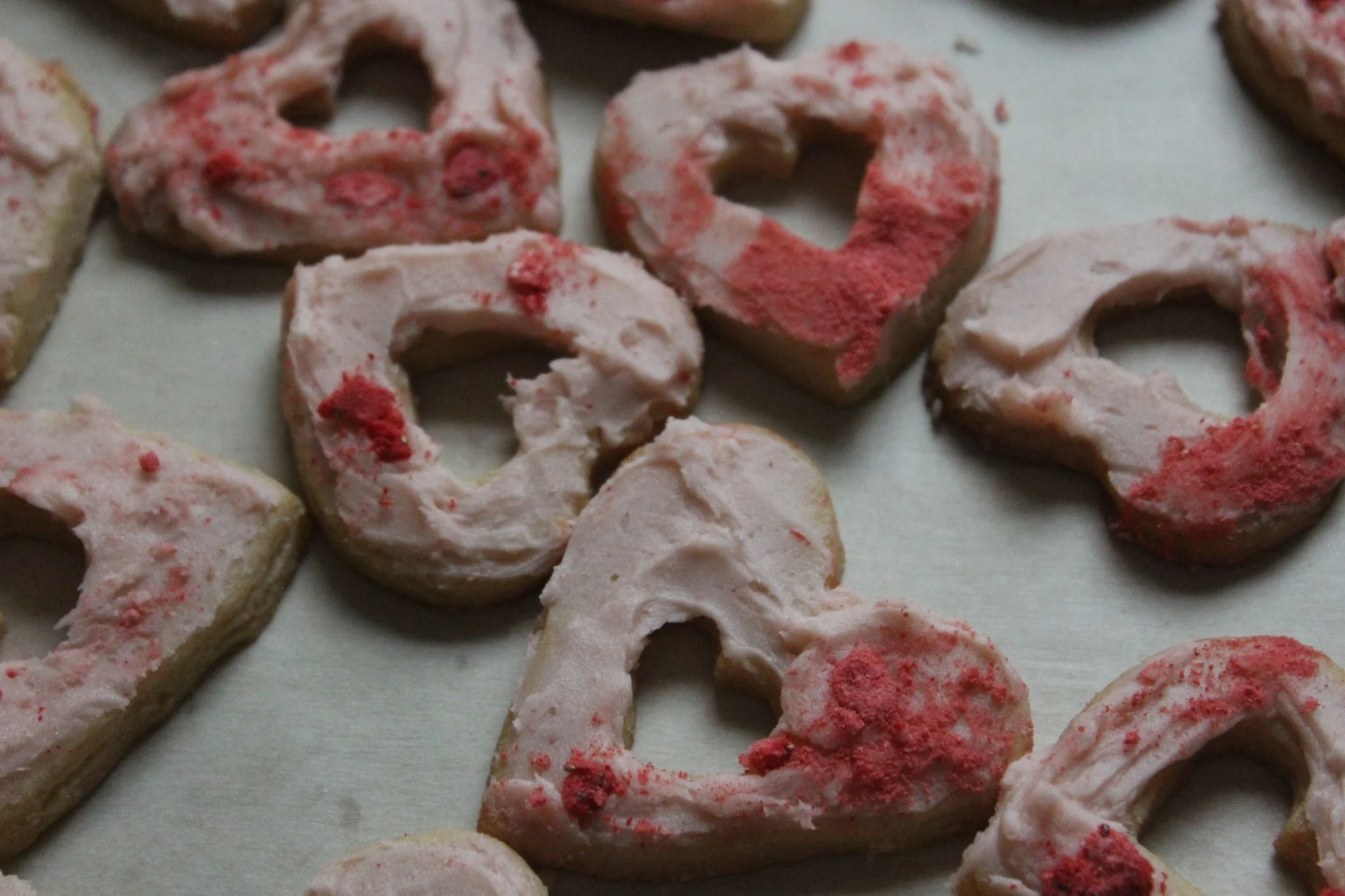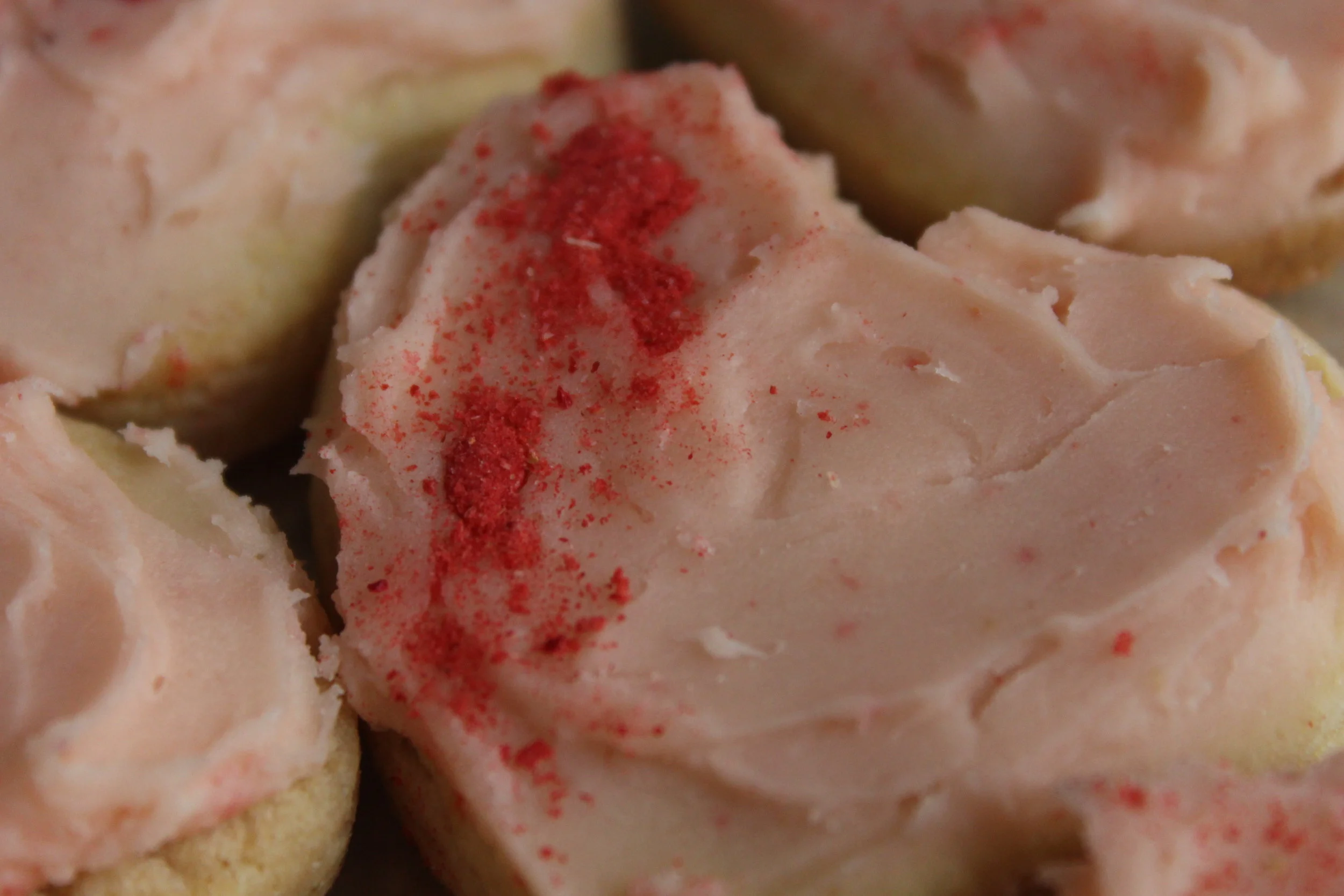 For months, these dehydrated berries have been hanging out in my cupboard. I forgot that I had gotten them at my last voyage to Trader Joe's in Portland (ME). This was the perfect way to use them. Their color was appropriate to the holiday, and their bright taste was a compliment to the subtler sugar cookie. I also mixed a tablespoon or two into the frosting, as well as sprinkling them on top for decoration--and more flavor!