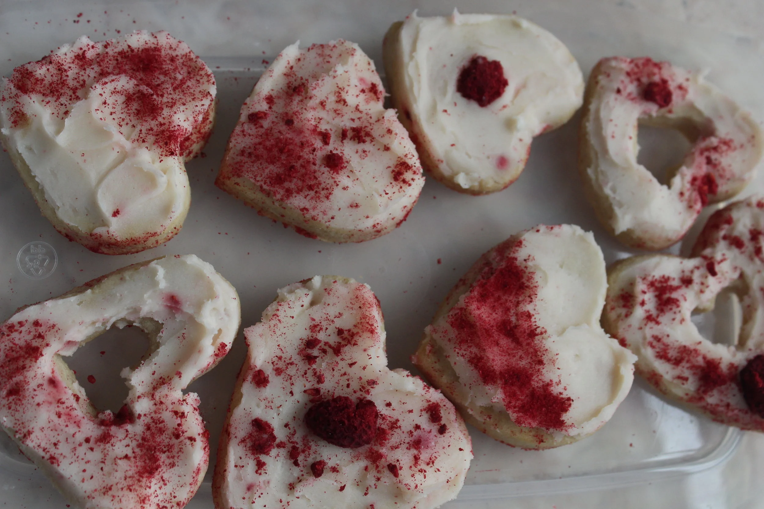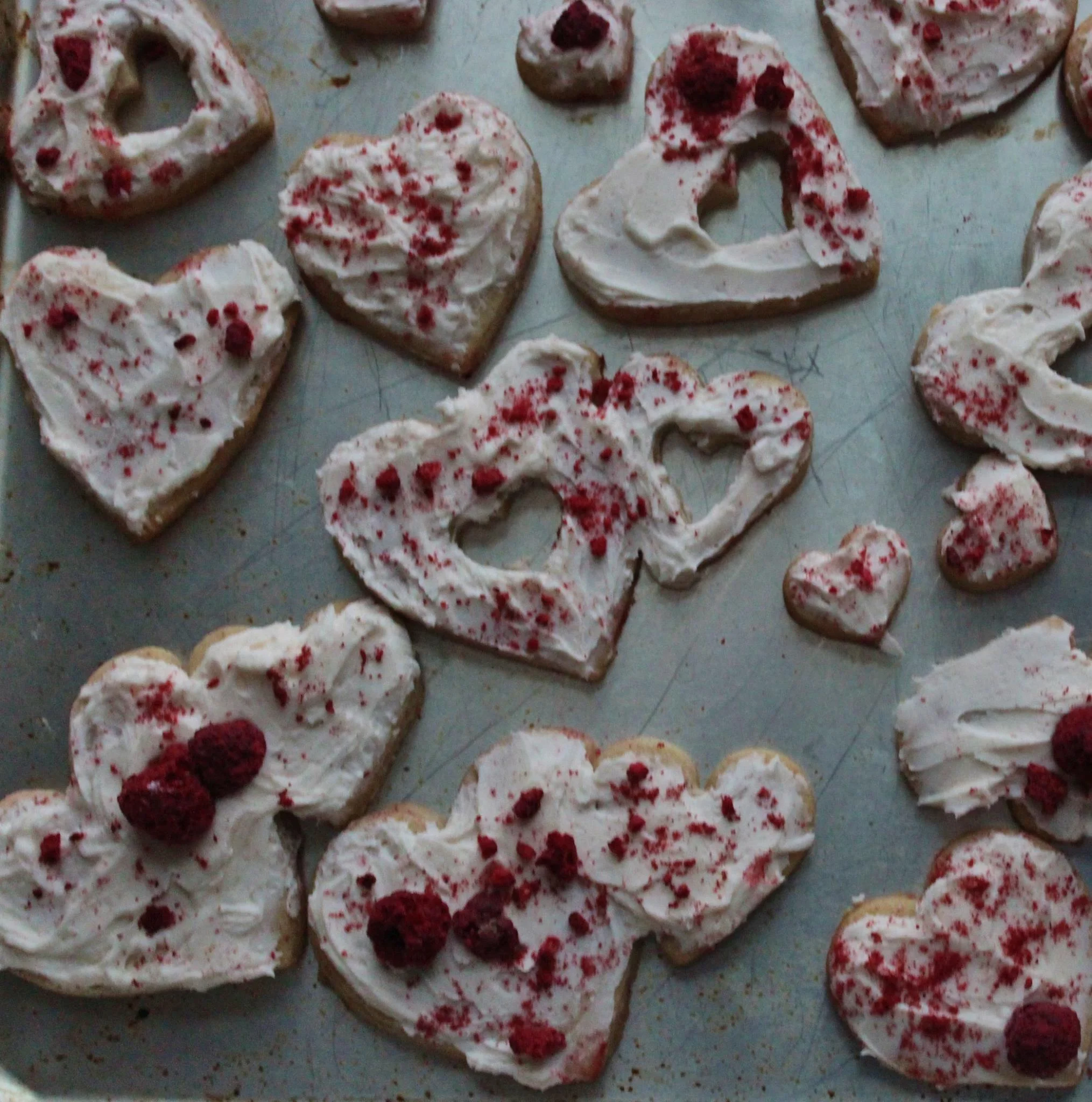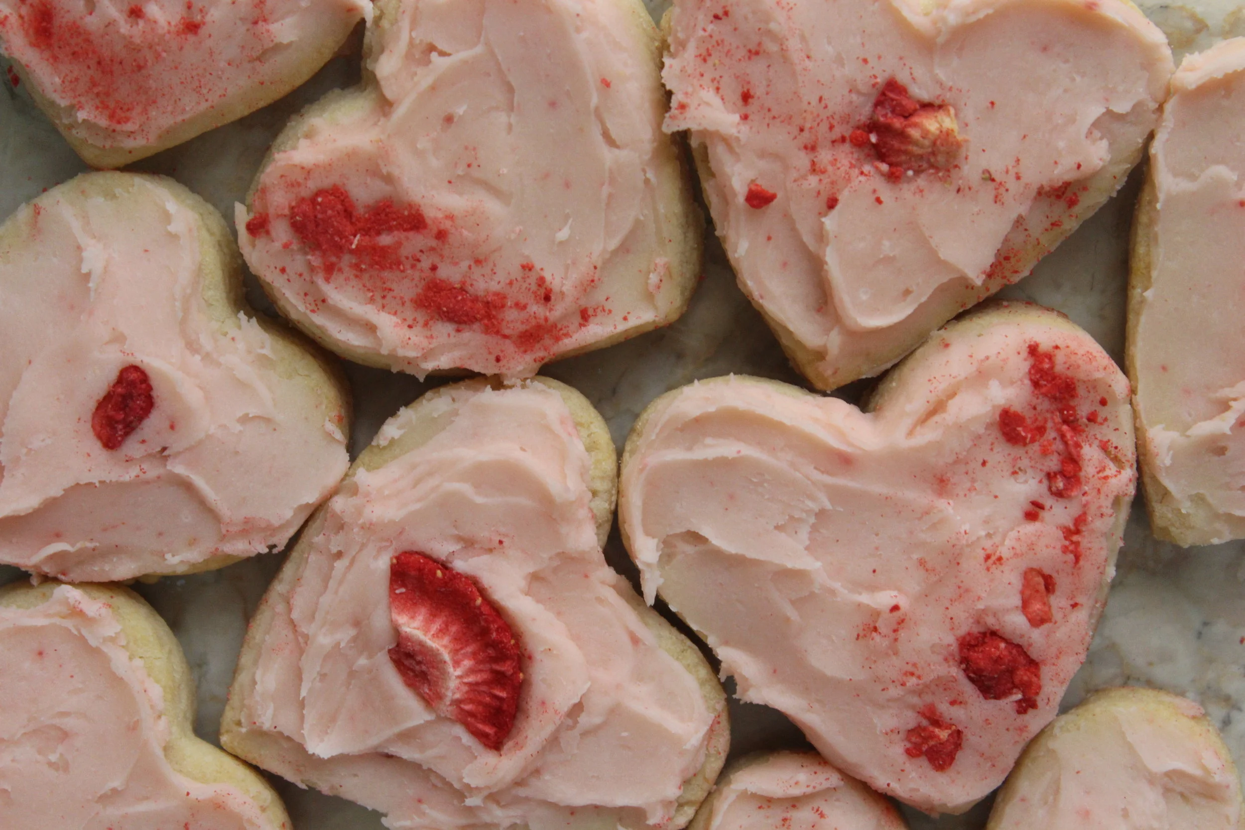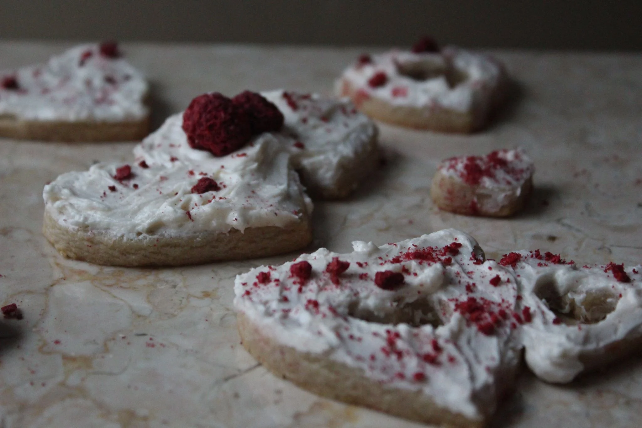 For months, these dehydrated berries have been hanging out in my cupboard. I forgot that I had gotten them at my last voyage to Trader Joe's in Portland (ME). This was the perfect way to use them. Their color was appropriate to the holiday, and their bright taste was a compliment to the subtler sugar cookie. I also mixed a tablespoon or two into the frosting, as well as sprinkling them on top for decoration--and more flavor!