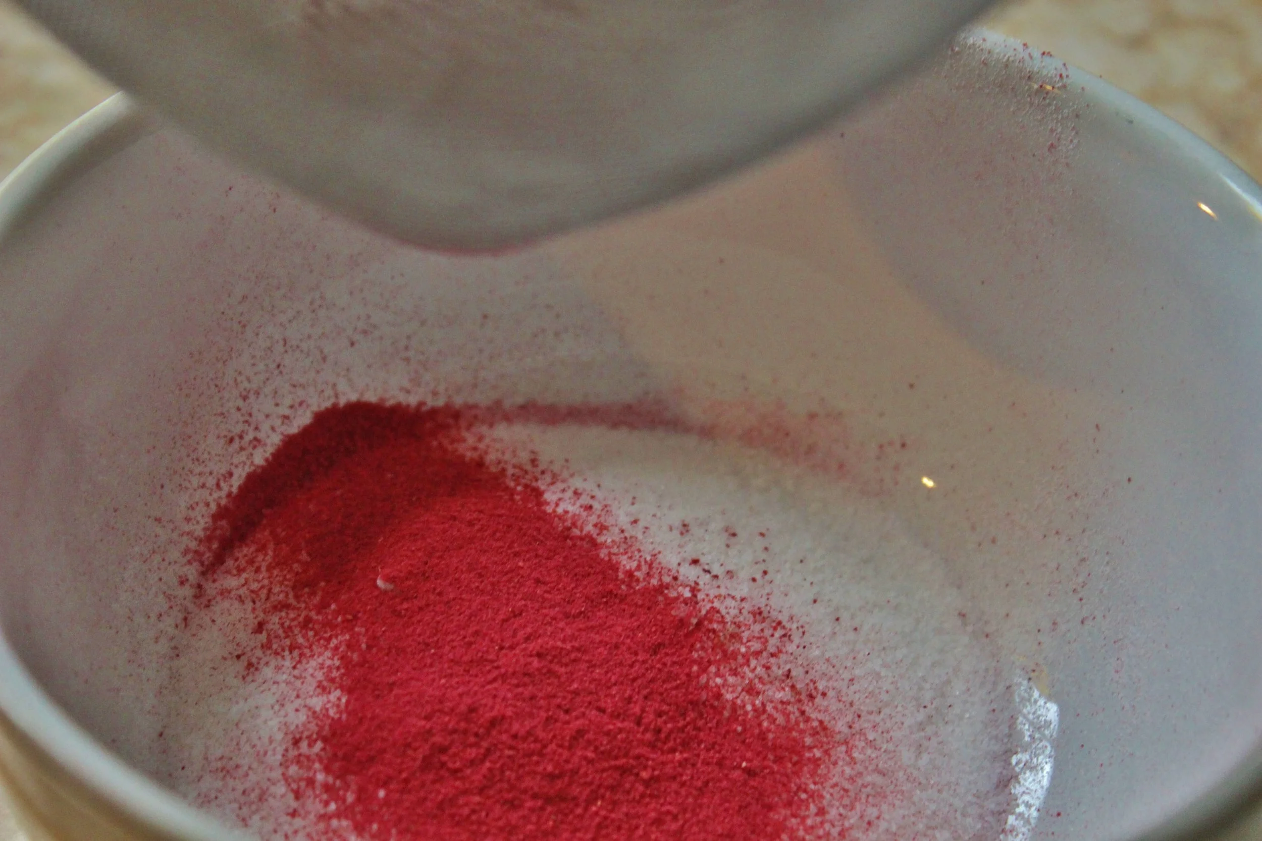 1 c unsalted butter, 3 c powdered sugar, 1 T whole milk, 1/4 tsp raspberry (I don't have real strawberry extract and the imitation stuff stinks!). Divide frosting in half. Then, I poured a T or more of the ground berries into each half of the frosting, I used more in the strawberry frosting to compensate for not having strawberry extract.
