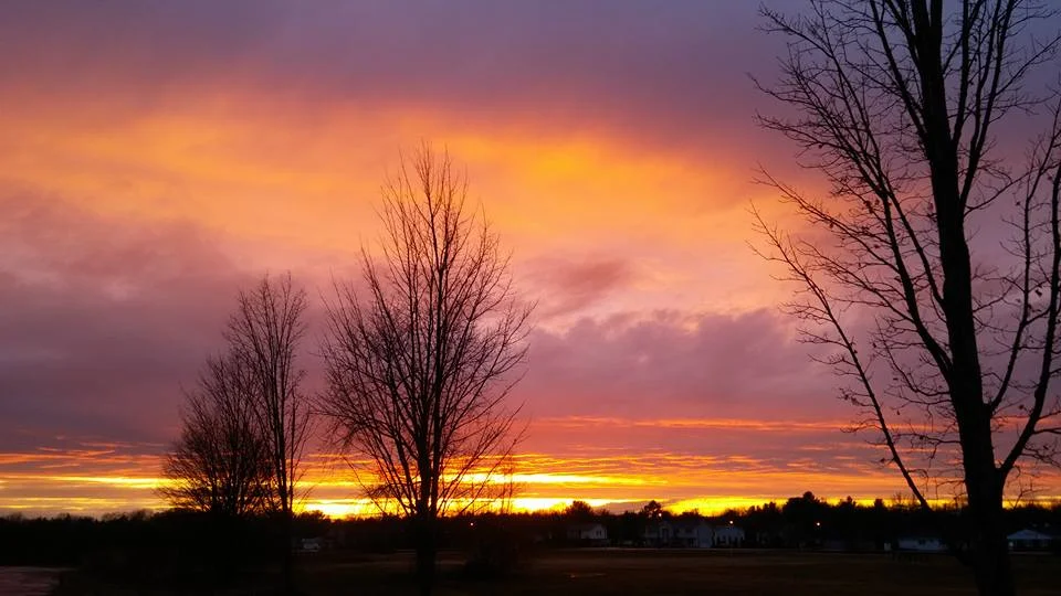 Monday and Tuesday of this week were dark, wet, dreary, and cold. Nothing can dampen the spirit like a cold rain in Maine. But, as I drove home from work Tuesday night, this happened. The clouds broke and the colors bloomed in the sky. It was the metaphor I needed--that the very things that made me feel blah, the low-hanging, dense rainclouds, were now the canvas on which the setting sun's colors were reflected. What brings sorrow can also bring joy. I'm going to try to hold on to this image as a reminder. Maybe I'll copy it and stick a photo in places to have it on hand--on my car visor, at my office, in my home, and in my purse. I'm grateful I had the chance to see this and to stop and take a picture of it.