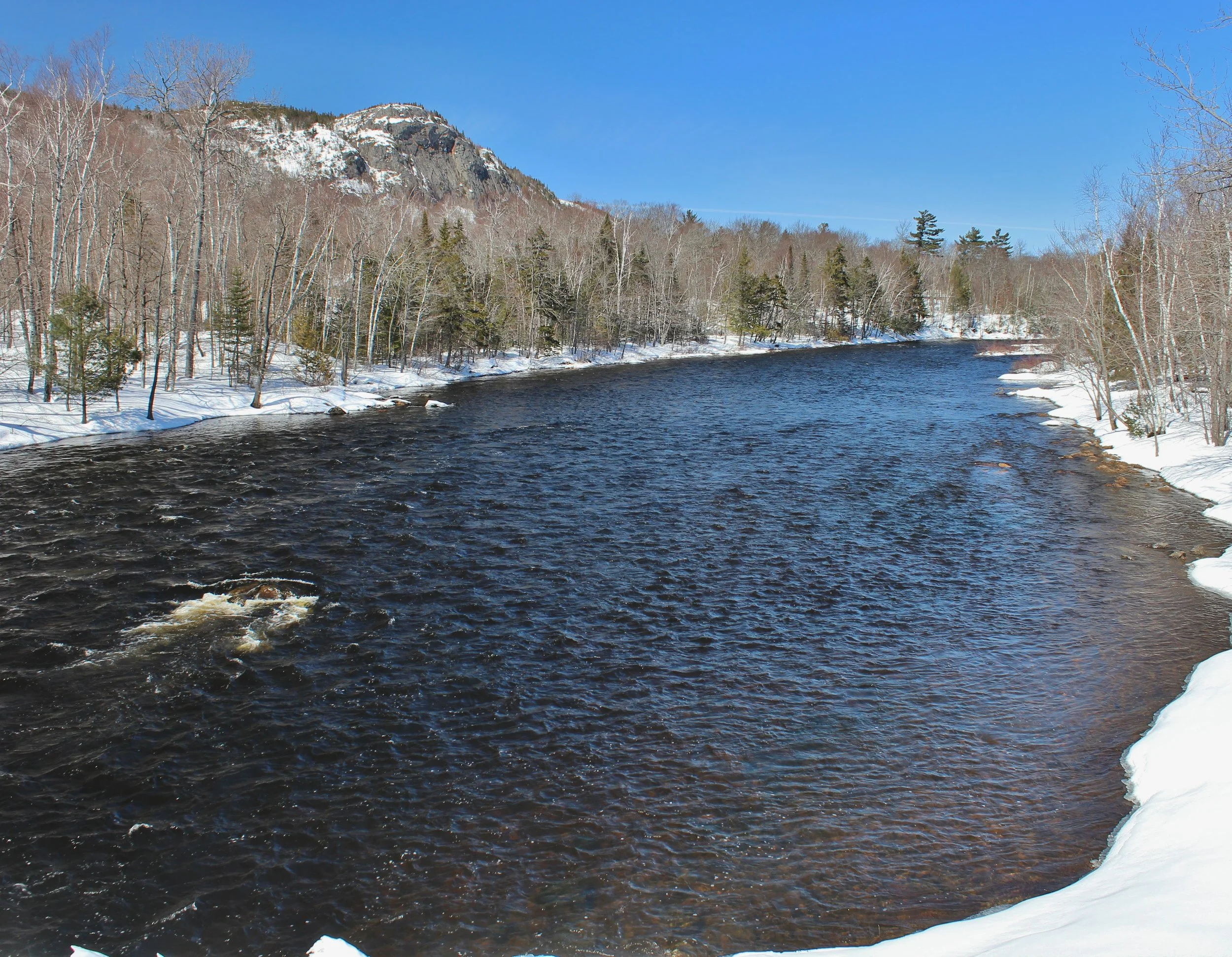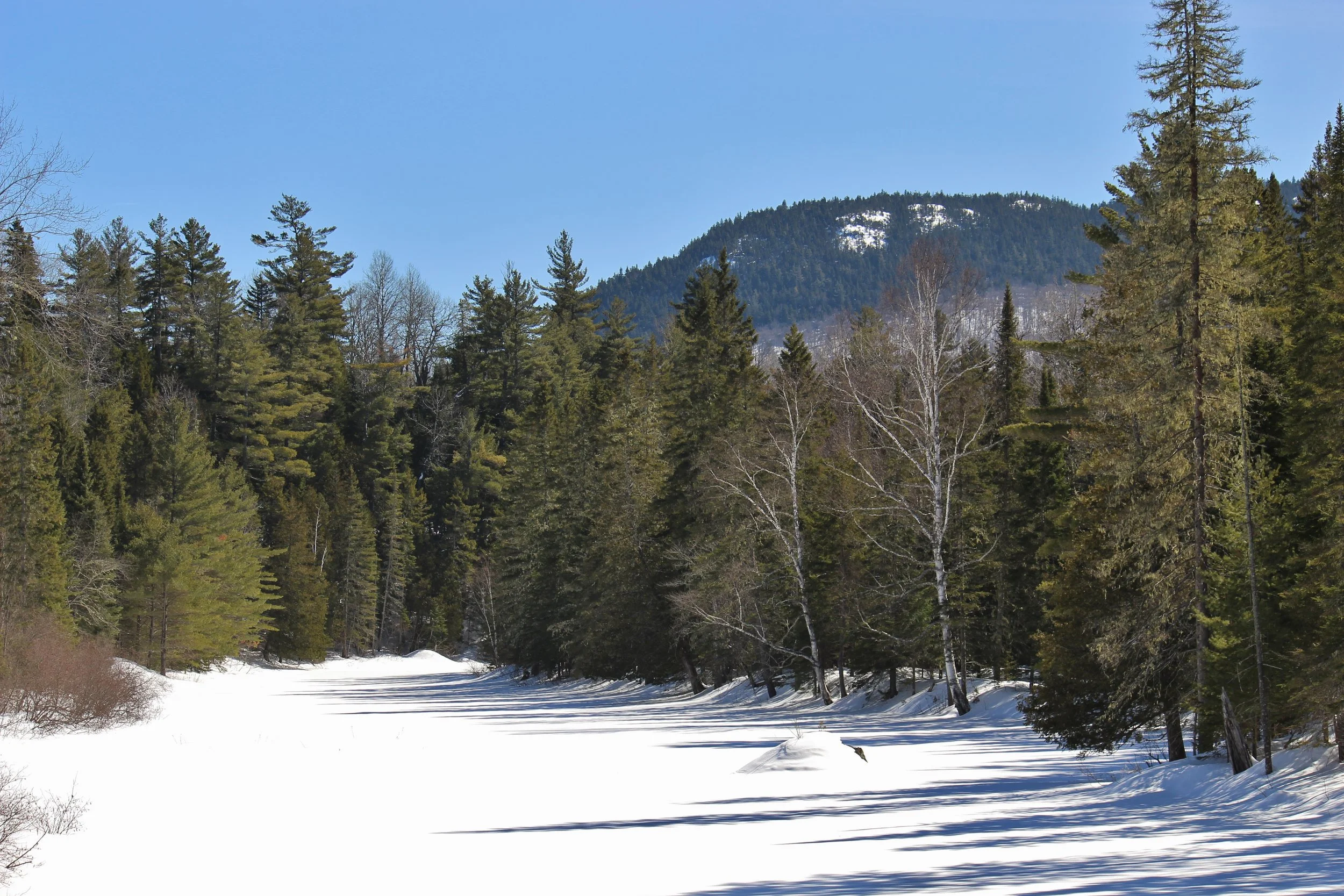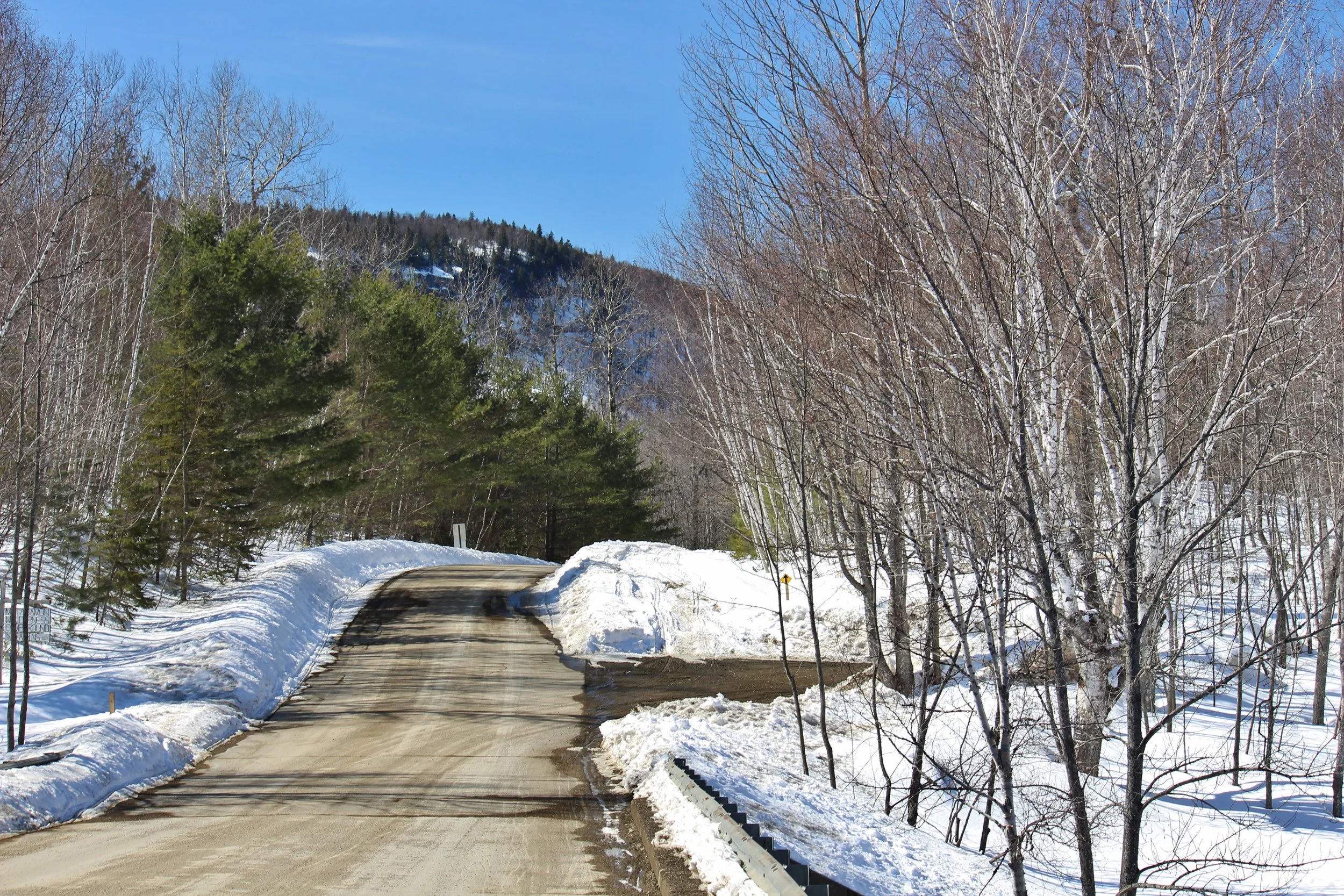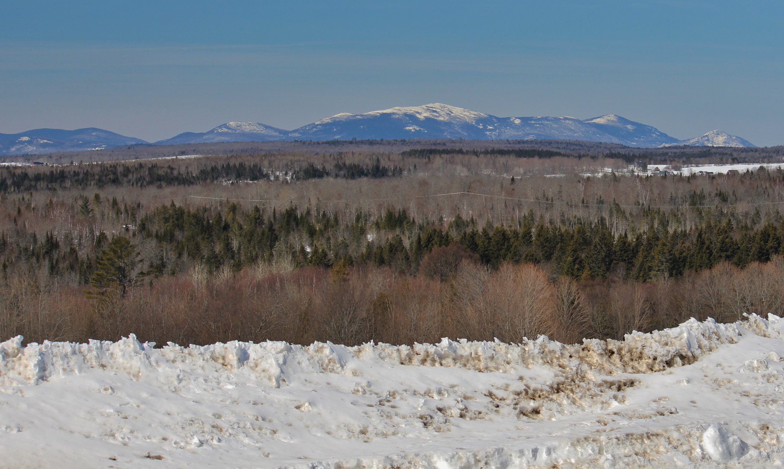 On the way to skiing, we passed the viewing spots for Maine's icon, Mt. Katahdin. It's an unusual mountain, in that it rises abruptly from fairly level ground. There are a few smaller mountains to its north and west, but it is basically alone, with a long, snow-clad summit. I decided that I would use the next day to drive up north of it and just enjoy empty roads and woods. I brought the dogs, so they wouldn't be penned inside all day.